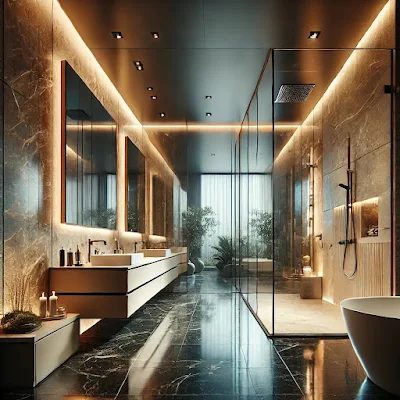 Material yang digunakan dalam desain kamar mandi modern memainkan peran penting dalam menciptakan suasana yang mewah dan nyaman. Salah satu material yang paling populer adalah marmer. Marmer tidak hanya memberikan kesan elegan dan mewah, tetapi juga tahan lama dan mudah dibersihkan. Anda bisa menggunakan marmer untuk lantai, dinding, atau bahkan untuk wastafel dan bathtub.